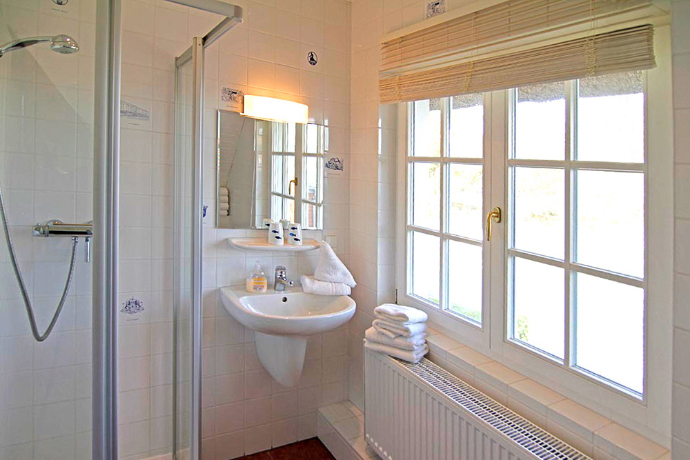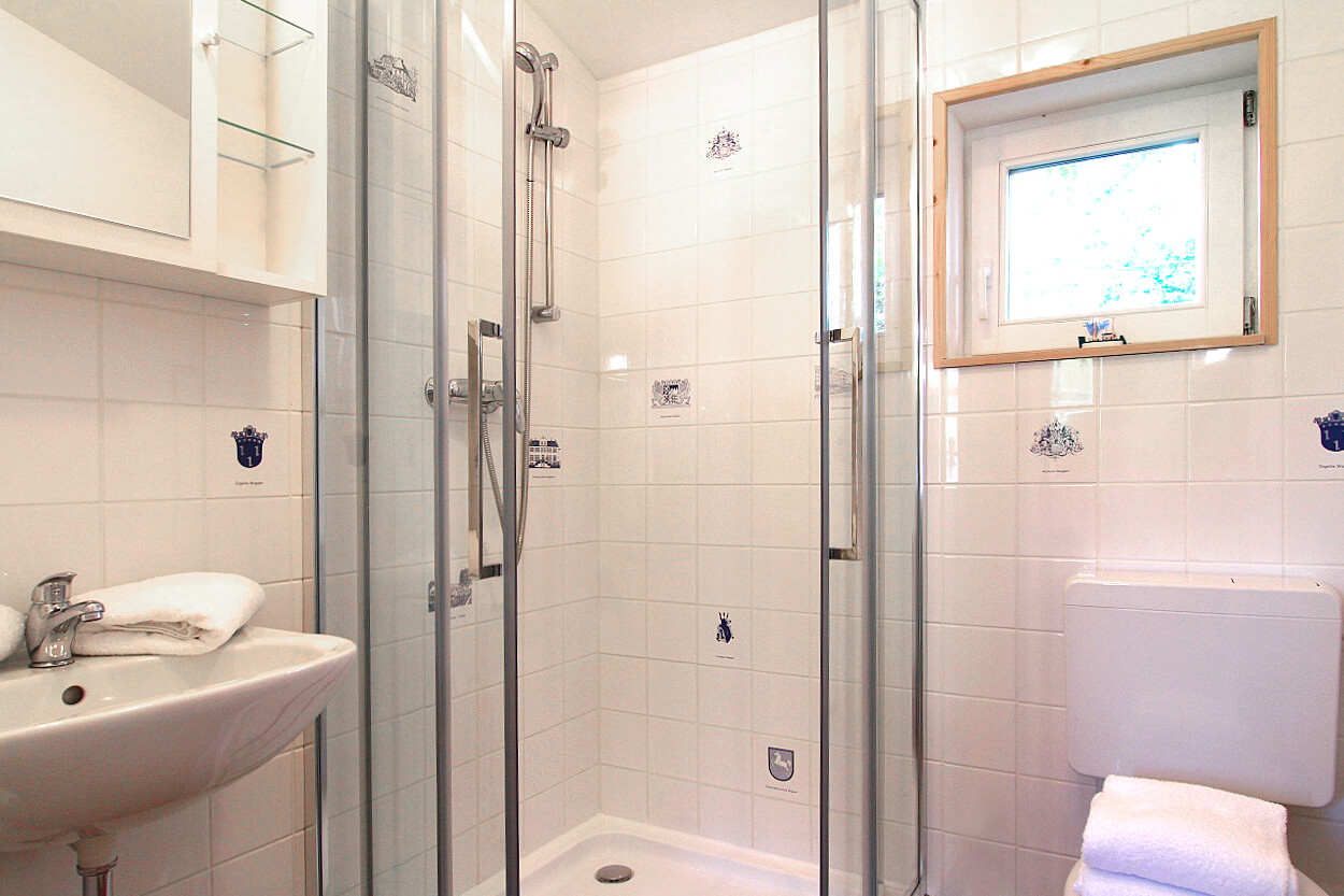 Das helle Tageslichtbad mit Dusche, WC und stilechten, hochwertigen Wandfliesen.