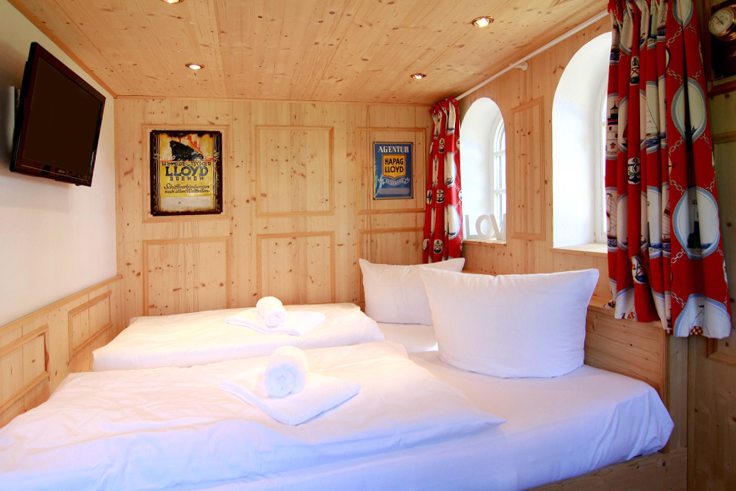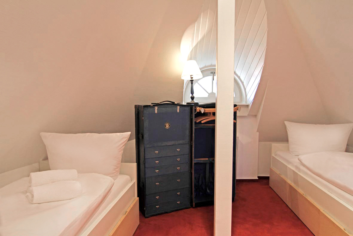 Mit zwei Einzelbetten und reichlich Stauraum unter den Betten.