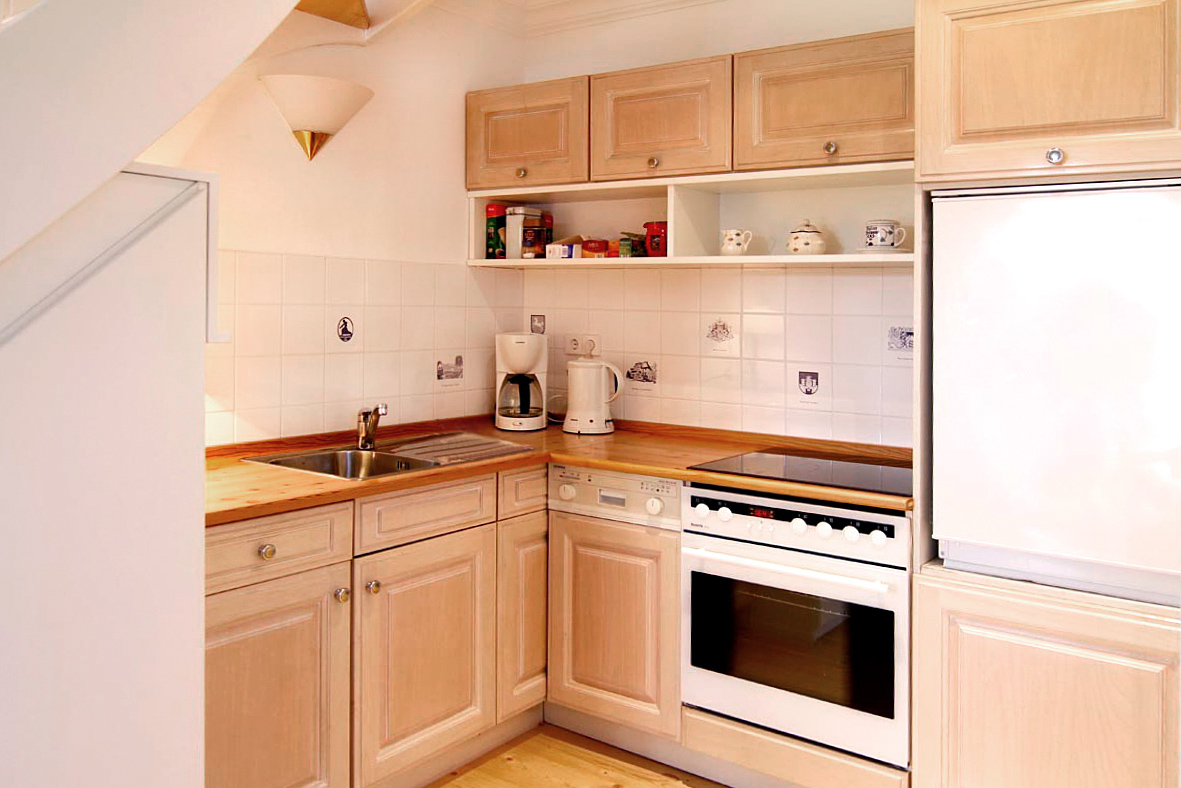 Eine offene Küche, bestens ausgestattet mit Backofen, Kühlschrank, Kaffeemaschine, Wasserkocher und einer Spülmaschine.